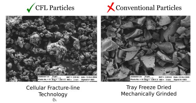 La structure cellulaire poreuse obtenue permet une préservation jusqu’à 20 fois supérieur des principes actifs comparativement à la lyophilisation conventionnelle, en évitant une hémorragie cellulaire via un broyage mécanique.